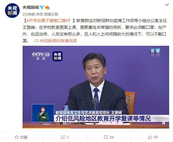至于是不是需要戴口罩?国家已经发布了戴口罩的指导意见,在低风险地区,在学校教室里上课是一个聚集性非常强的场所,要求必须戴口罩。在户外、运动场,人员没有那么多,而且人和人之间间隔比较大的情况下是可以不戴口罩的。但从总体上来说,为了确保整个开学工作的顺利和疫情防控工作真正落到实处,各地各校都针对学生应该形成的良好的自我防控措施作出了详细规定,因为各个地区的疫情防控要求并不一样,可能每个学校都会有一些细微差异,但总体上还是要确保安全,作为开学的一个前提。