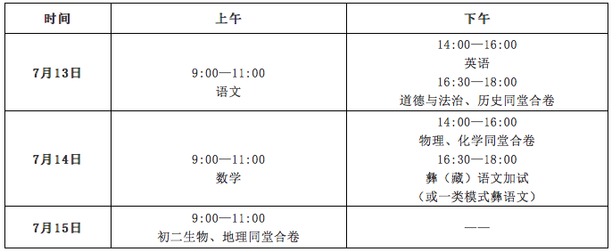 中考考试科目:语文、数学、英语(含听力)、物理(含实验操作)、化学(含实验操作)、道德与法治、历史、体育、彝(藏)语文加试(二类模式考生参加)、一类模式彝语文(一类模式考生参加);初二学业水平考试科