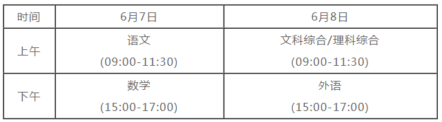 6月8日9:00至11:30文科综合/理科综合;15:00至17:00外语,有外语听力测试内容的应安排在外语笔试考试开始前进行。